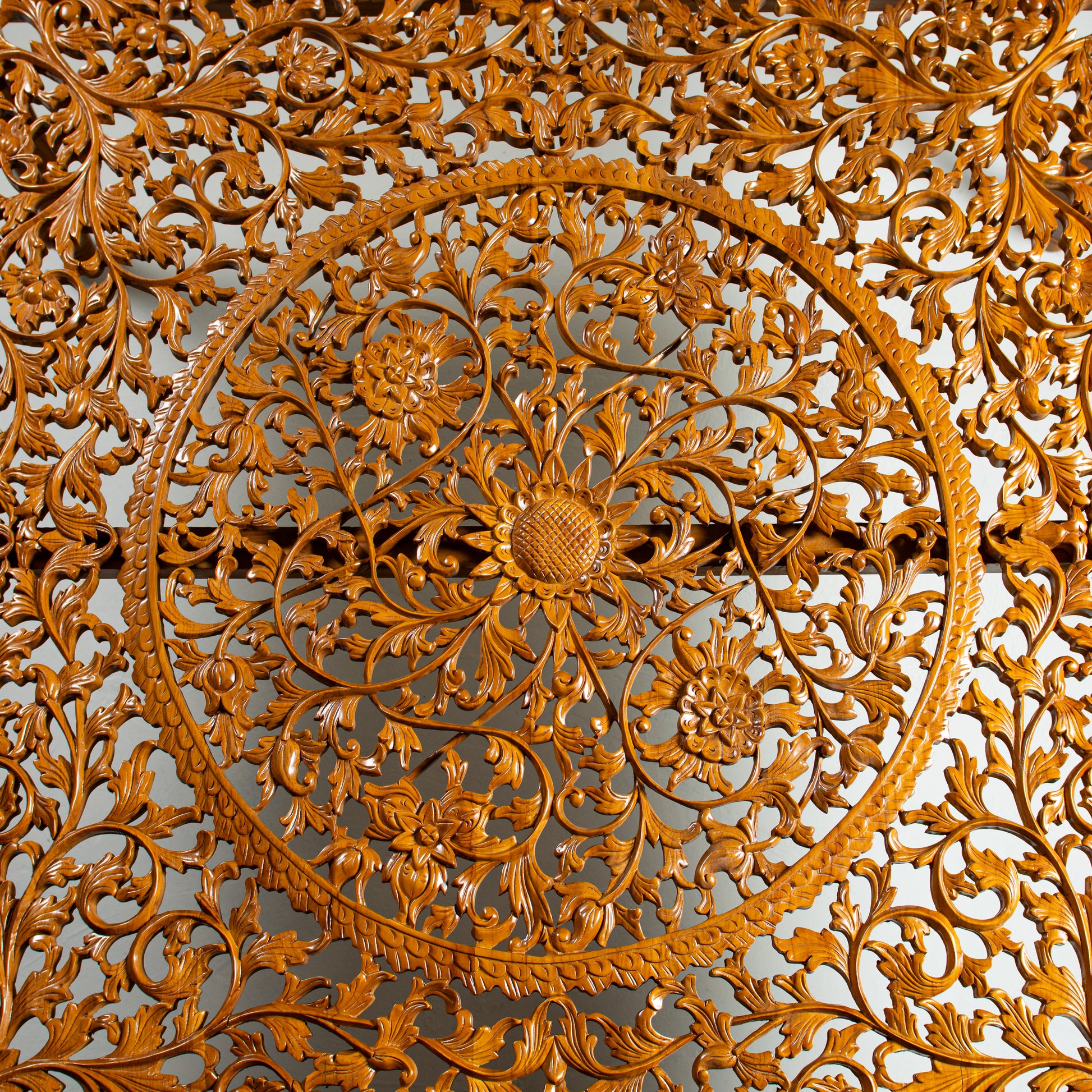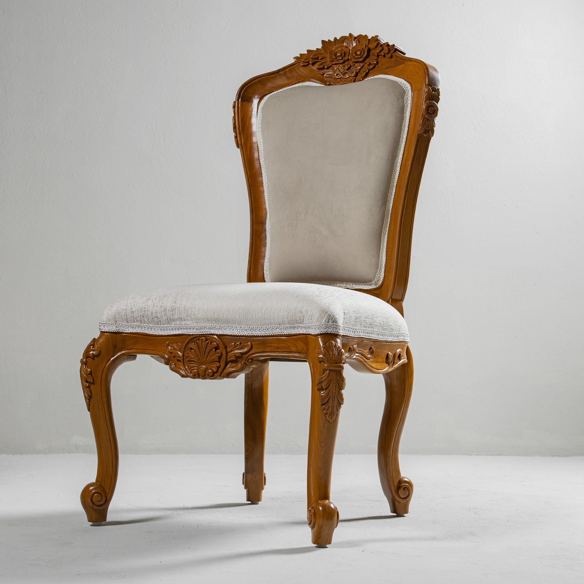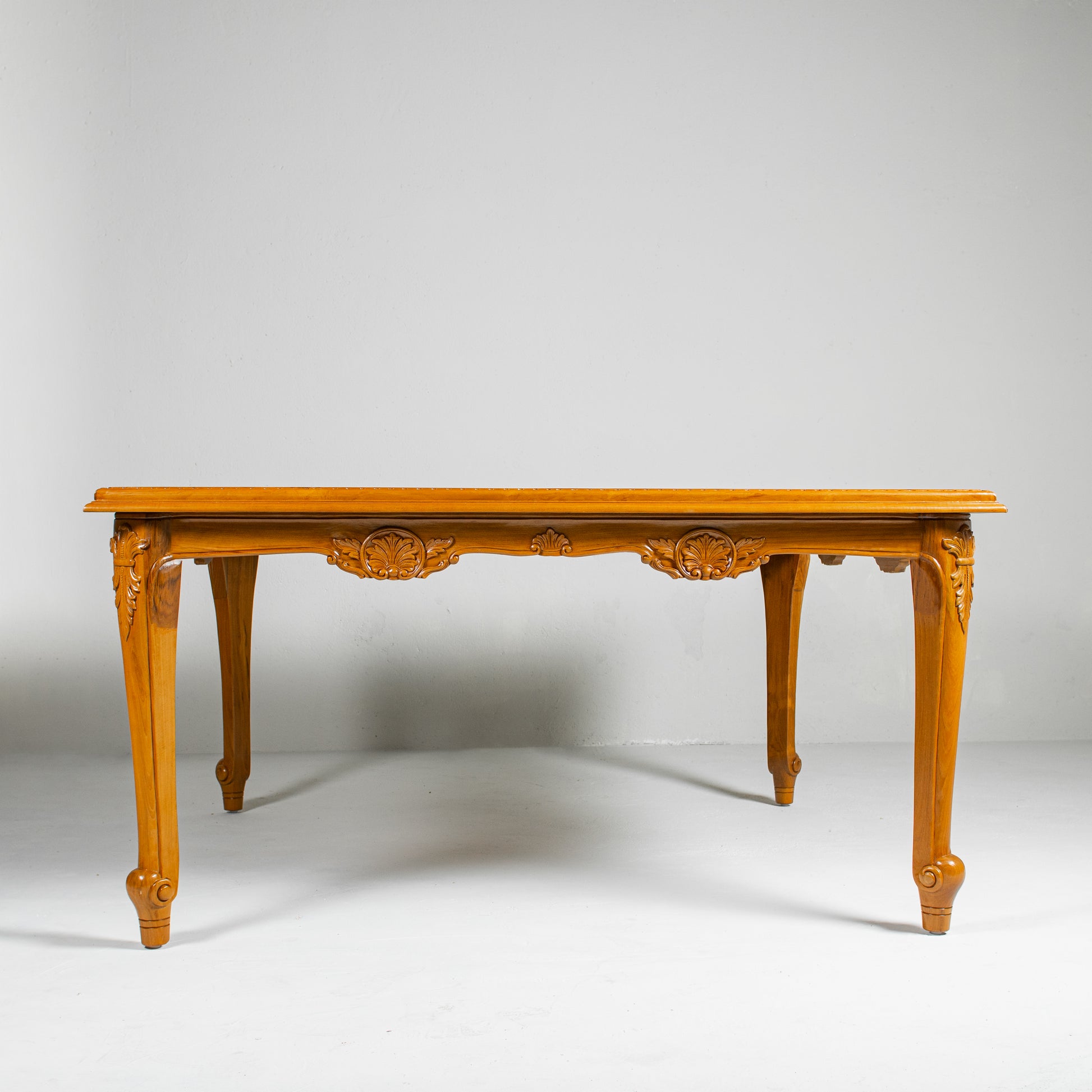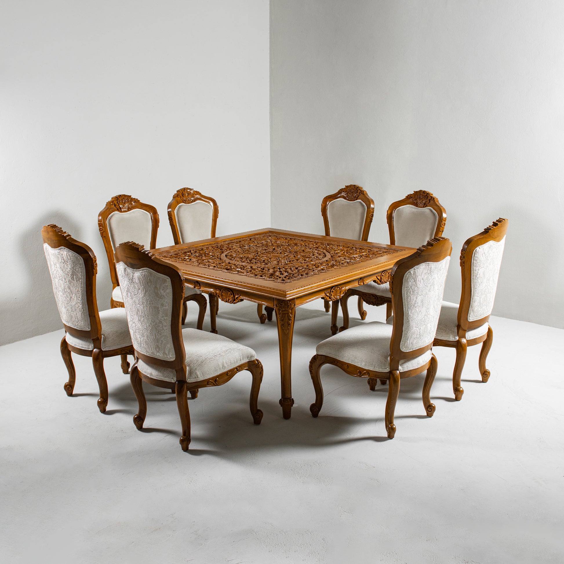 Elevate your dining experience with this luxurious 8-seater table, handcrafted from solid teak wood. The tabletop features detailed full-flower carvings, protected by a clear glass layer that adds elegance and ease of maintenance. The chairs and set are fully customizable—from fabric to finish and color—to perfectly match your style.